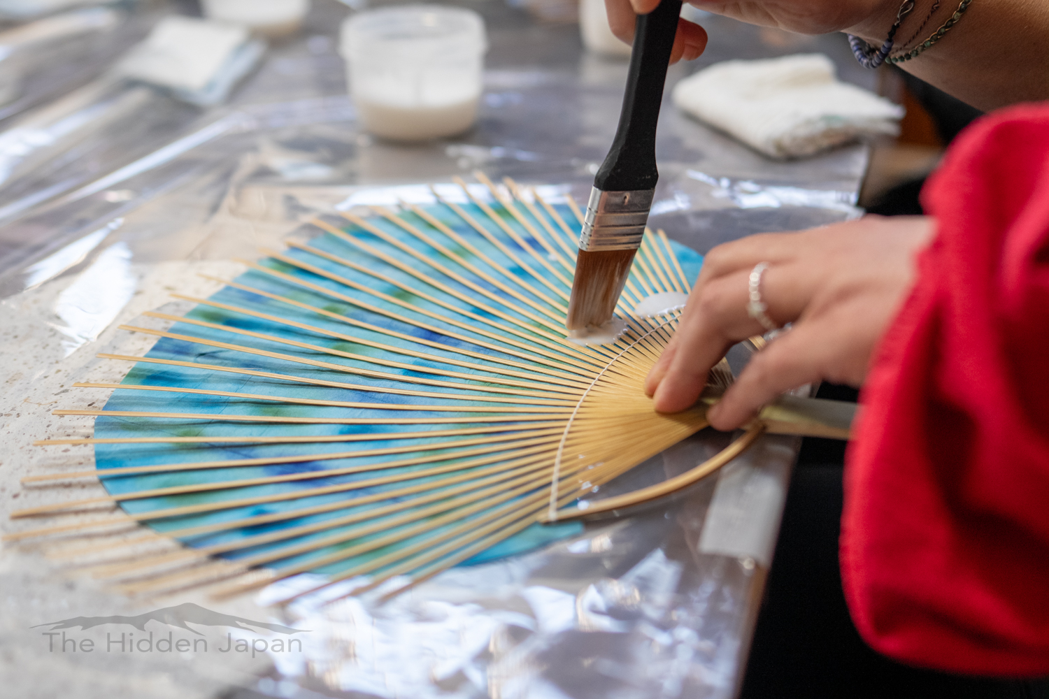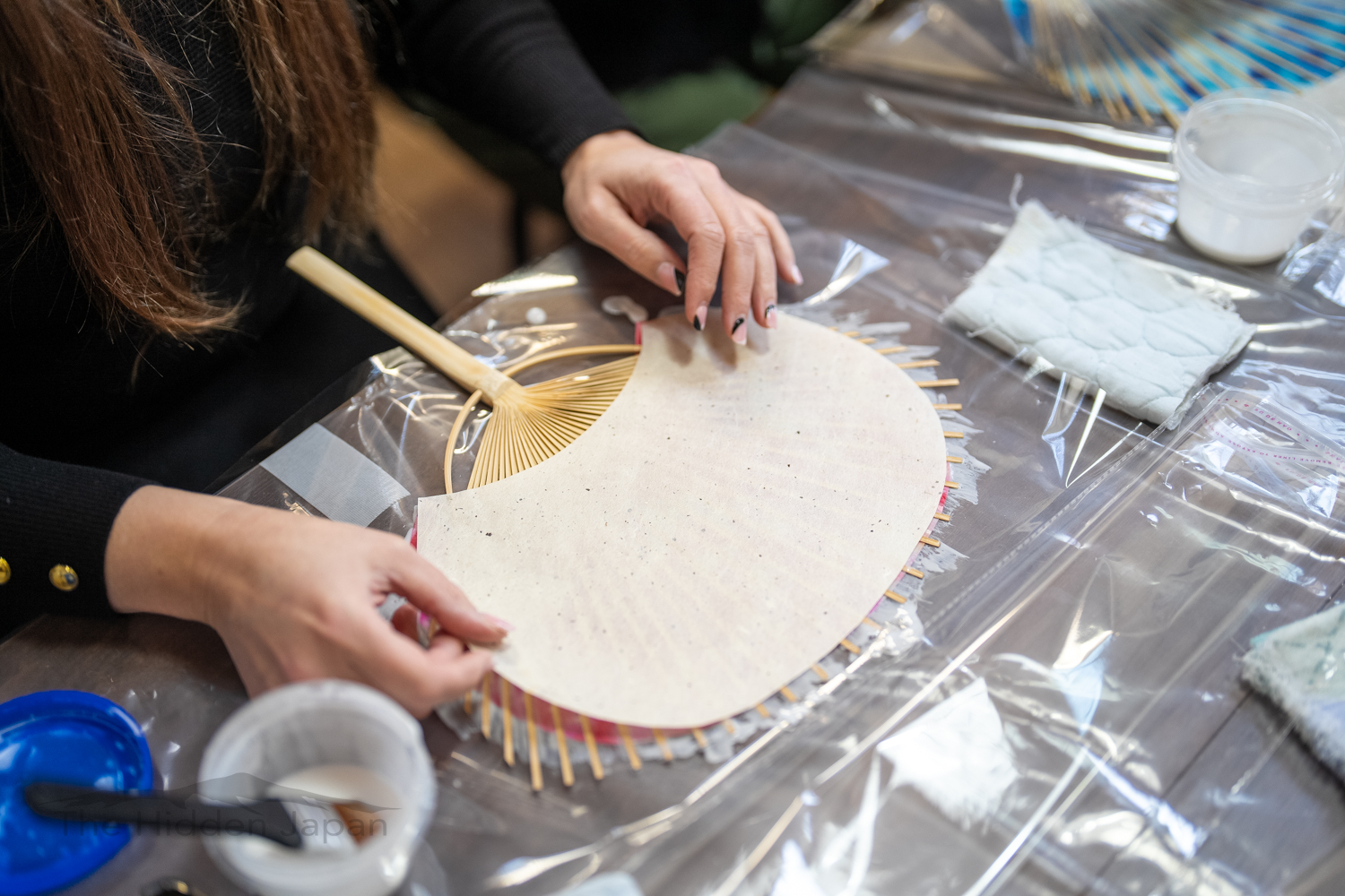 Under the guidance of the staff, you will glue the washi paper onto the frame of the fan, and you can take home the finished fan.