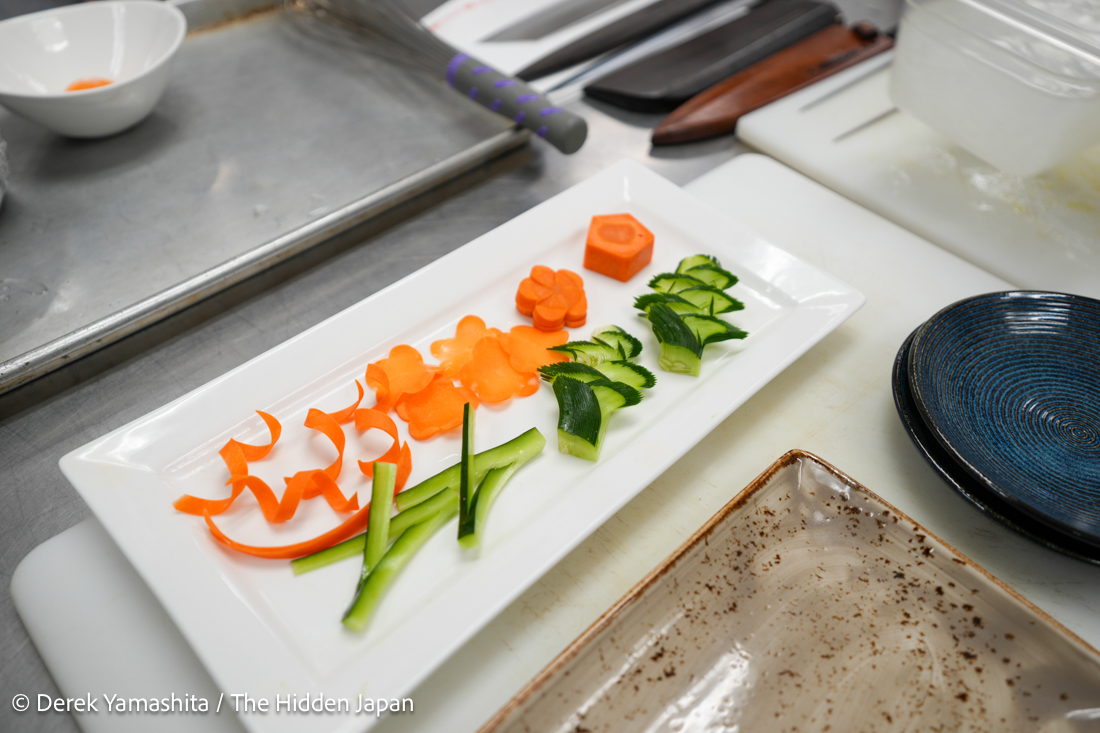 One of the foundational techniques included katsuramuki, the traditional method of peeling vegetables—typically daikon—into a continuous thin sheet, which is then finely cut for presentation.